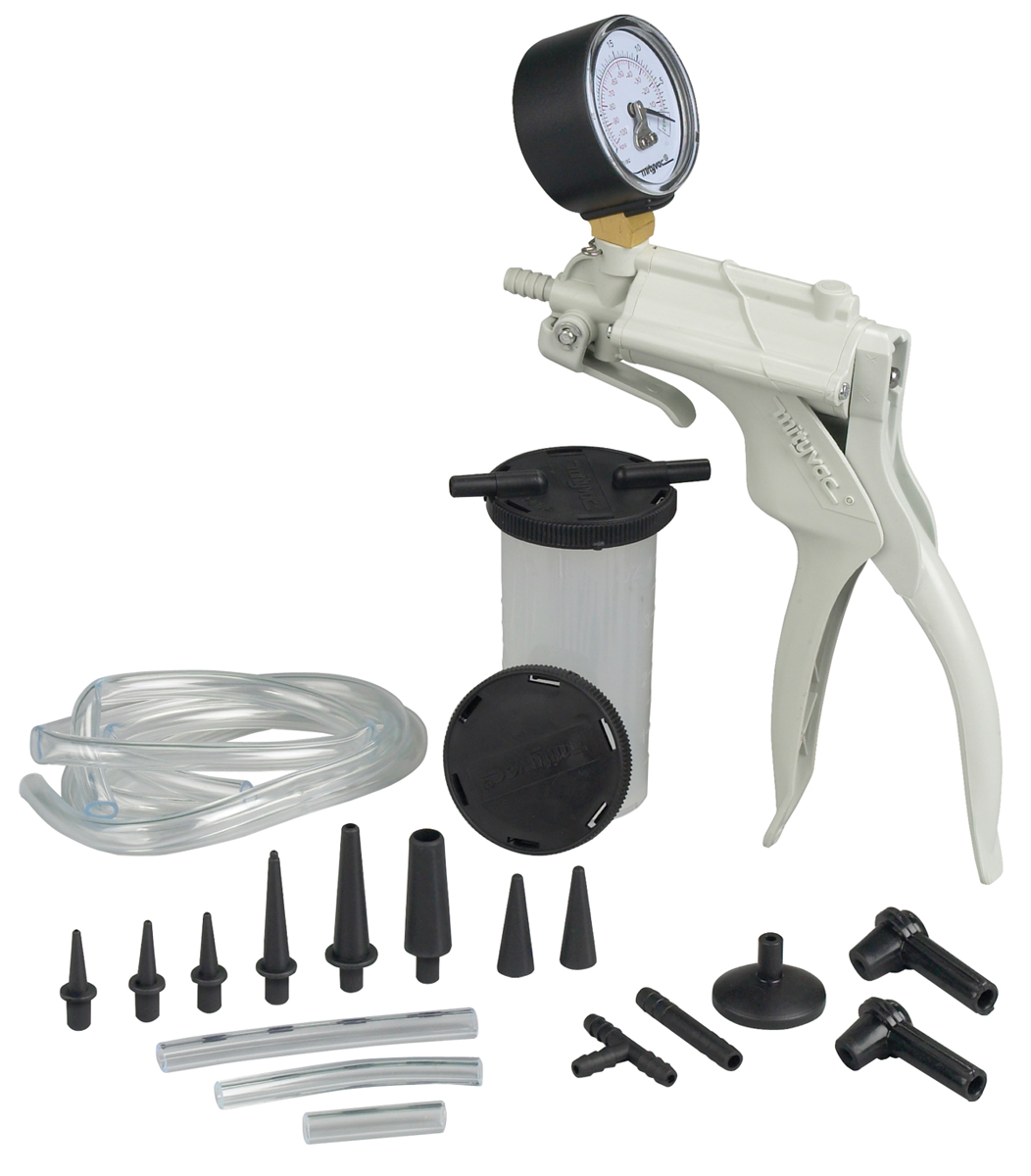 Included with the pump, are accessories essential for one-man brake bleeding, and testing and diagnostics or vacuum and pressure related engine systems. With this kit, one person can quickly and cleanly bleed automotive brake and hydraulic clutch systems, as well as get answer to numerous diagnostic and mechanical problems.
